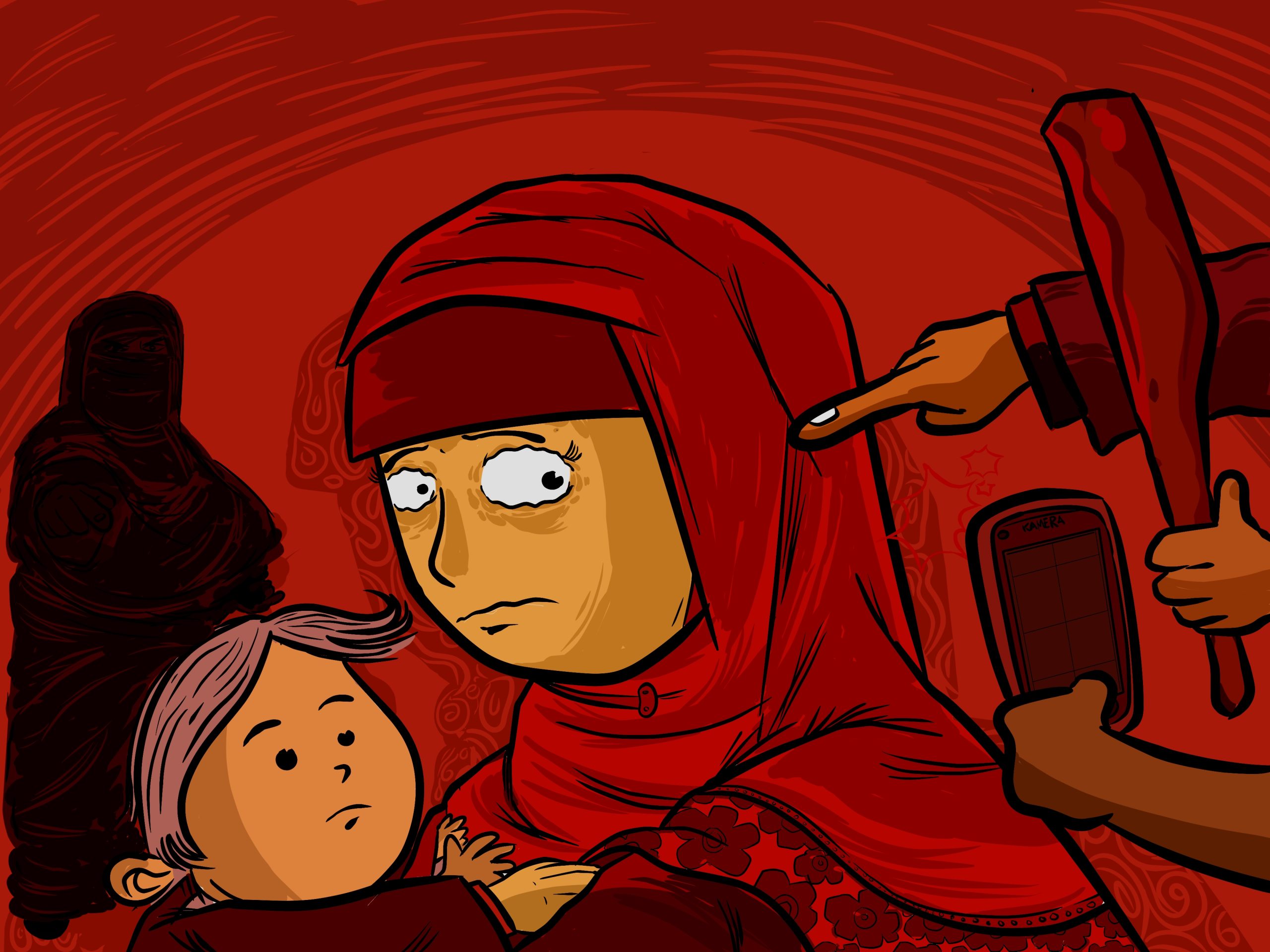 Tiba-tiba jilbab Zaenab yang menutupi sebagian badannya ditarik paksa dari arah belakang hingga sobek, membuat tubuhnya hilang keseimbangan sesaat, nyaris terjatuh, ketika para lelaki penghadang yang mengenakan jubah gamis memegang balok kayu dan tombak mendekat–mengerubungi. Mereka tidak berhenti meneriakan ‘Allahuakbar’ dibalik setiap tindakan.